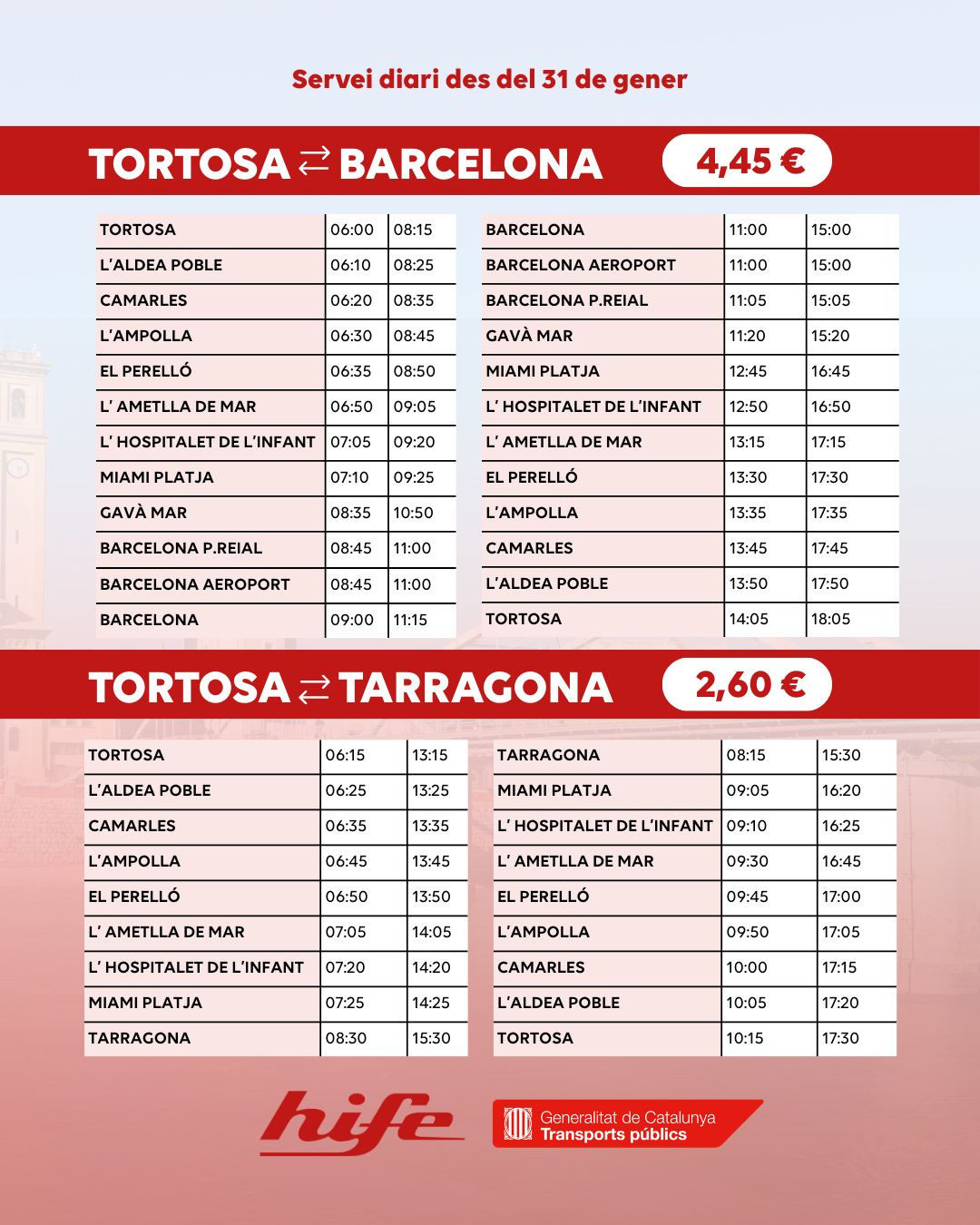 Tortosa ⇄ Barcelona / Tarragona Prices: Tortosa ⇄ Barcelona: €4.45 Tortosa ⇄ Tarragona: €2.60 (Click here to view timetables)