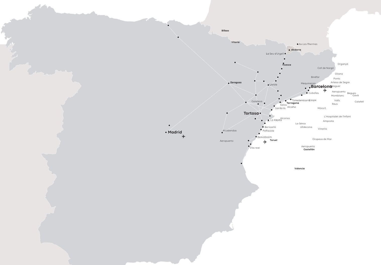 - Cataluña, con conexiones entre Barcelona, Tarragona y las Tierras del Ebro